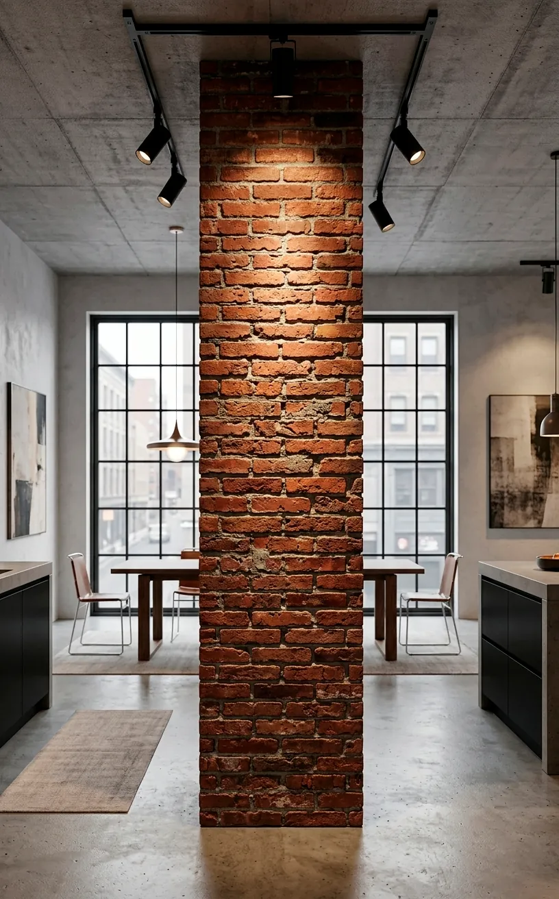 You can finish the look with some industrial track lighting directed right at the brick to highlight the uneven surfaces. It makes the pillar look like a piece of history that the building was constructed around.