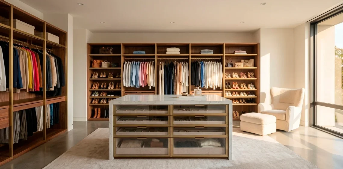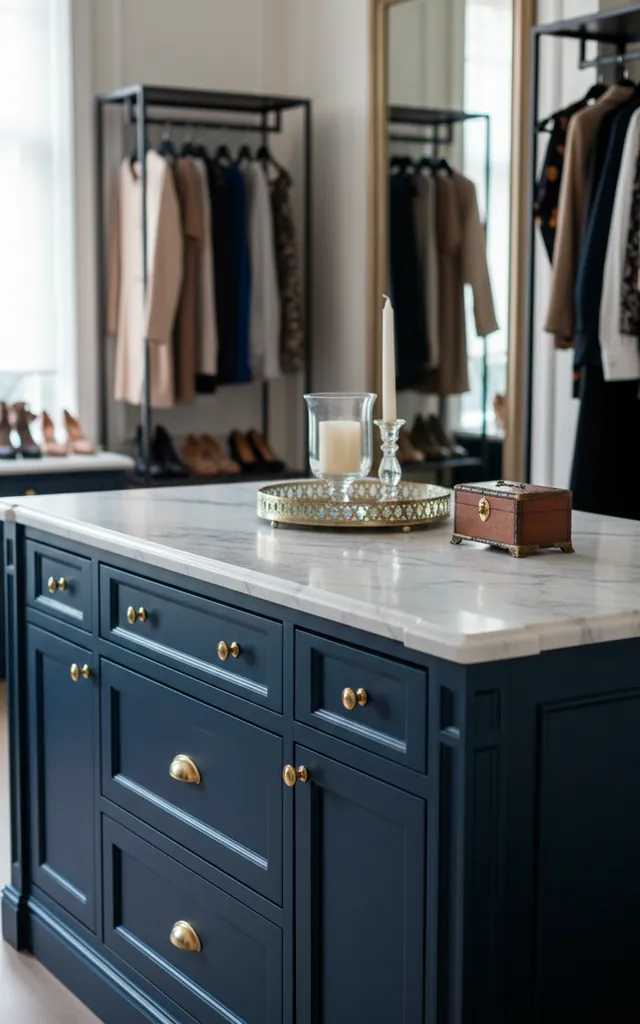 If you have the floor space, an island offers the ultimate power move. It provides a flat surface for folding clothes and houses those tiny items that usually disappear. I keep my watch collection and sunglasses here so I don’t lose my mind every morning. Custom drawer inserts keep every accessory in its place.