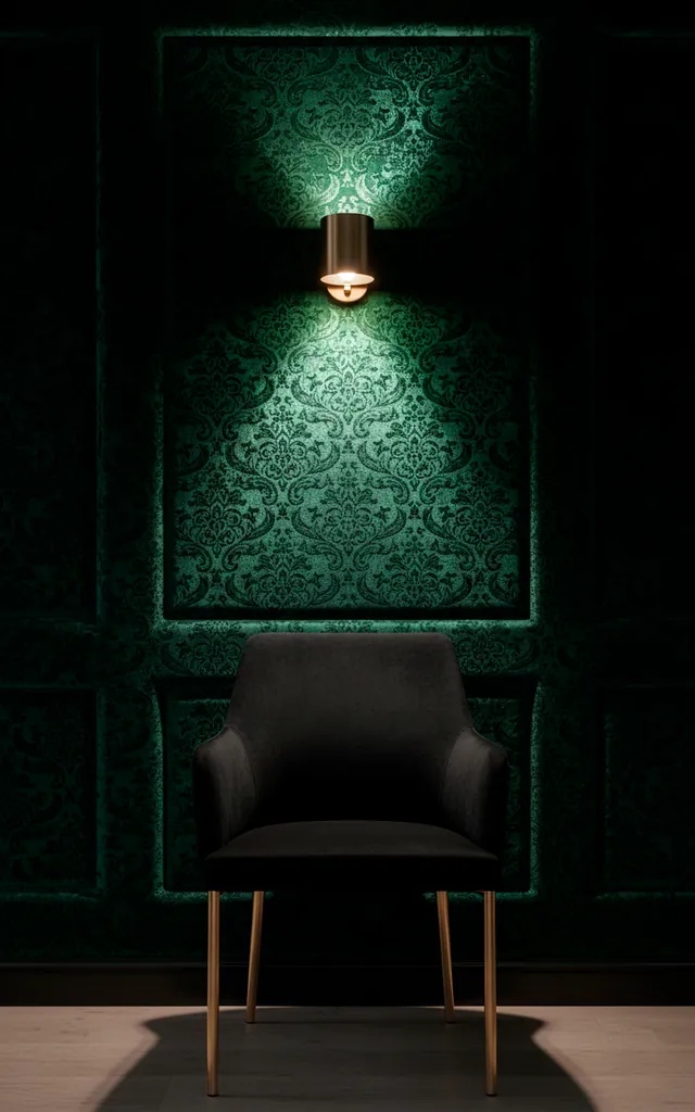 Why use wallpaper when you can use fabric? Embossed velvet with a subtle damask pattern creates a “moody fashion editor” vibe that I absolutely live for.