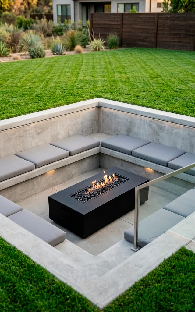 Level changes are the secret sauce of minimalist design. Instead of cluttering the space with chairs, dig down and build the seating into the ground. I helped a friend do this with a square concrete pit, and it became the only place anyone wanted to hang out. It keeps the sightlines clear across the yard so nothing blocks your view. Toss in a few high-quality outdoor pillows and a simple gas burner. Why settle for a rusty metal bowl when you can have a literal lounge?