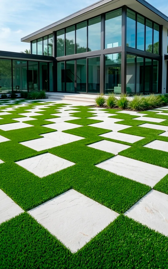 Let’s be honest: real grass is a needy drama queen. I swapped mine for a grid of artificial turf and concrete squares, and I’ve never looked back. The geometry provides a rhythmic, orderly feel that calms the brain instantly. It looks green all year round without a drop of water or a minute of mowing. FYI, this is the best way to handle high-traffic areas without getting mud everywhere. Do you actually enjoy weeding, or would you rather be napping?