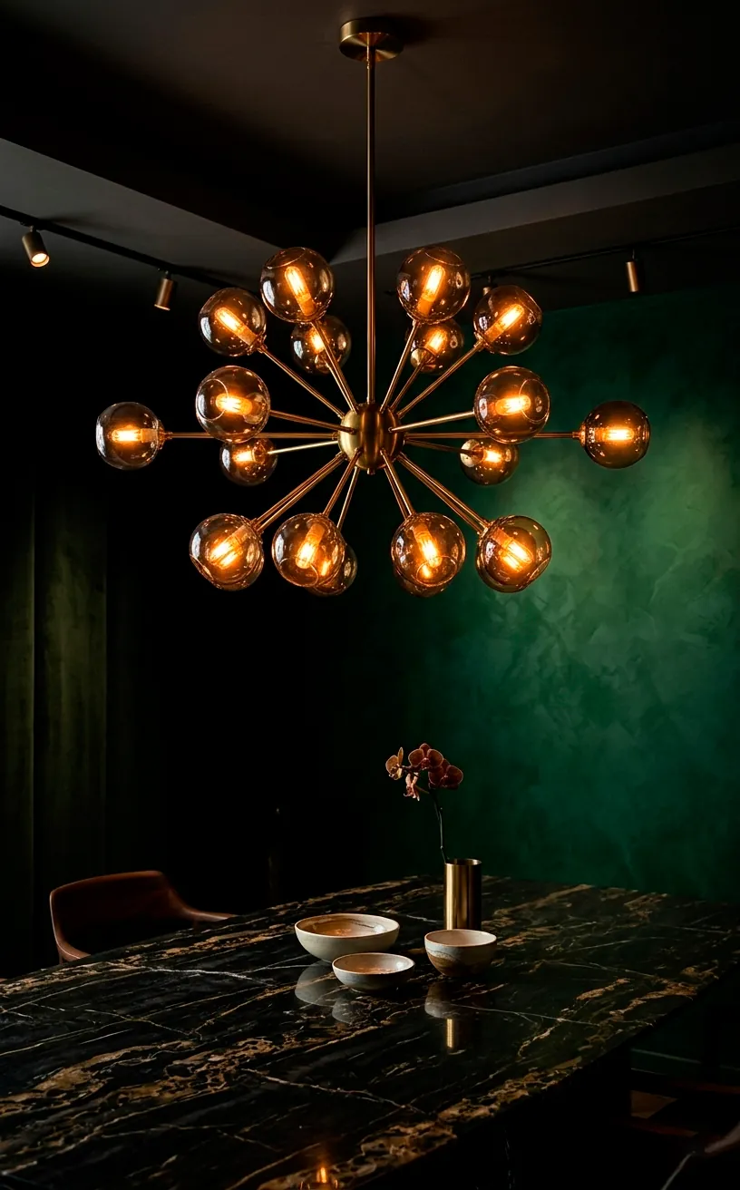 Lighting represents the make-or-break element in any moody design. You can’t just slap a basic flush-mount on the ceiling and call it a day! I recommend a large, sculptural chandelier that acts as the focal point of the entire room. Think brass arms, smoked glass globes, or even a vintage-inspired iron piece.