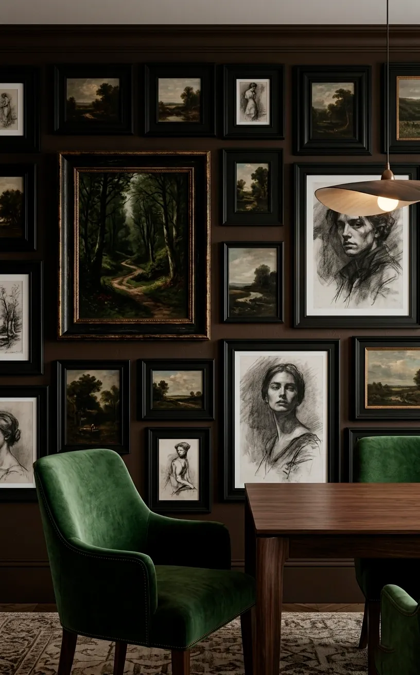 Empty walls kill a moody vibe faster than you can say ‘beige.’ I find that a tightly packed gallery wall with black or dark wood frames adds incredible depth. You don’t need expensive oil paintings; even simple sketches or moody landscape prints work wonders.