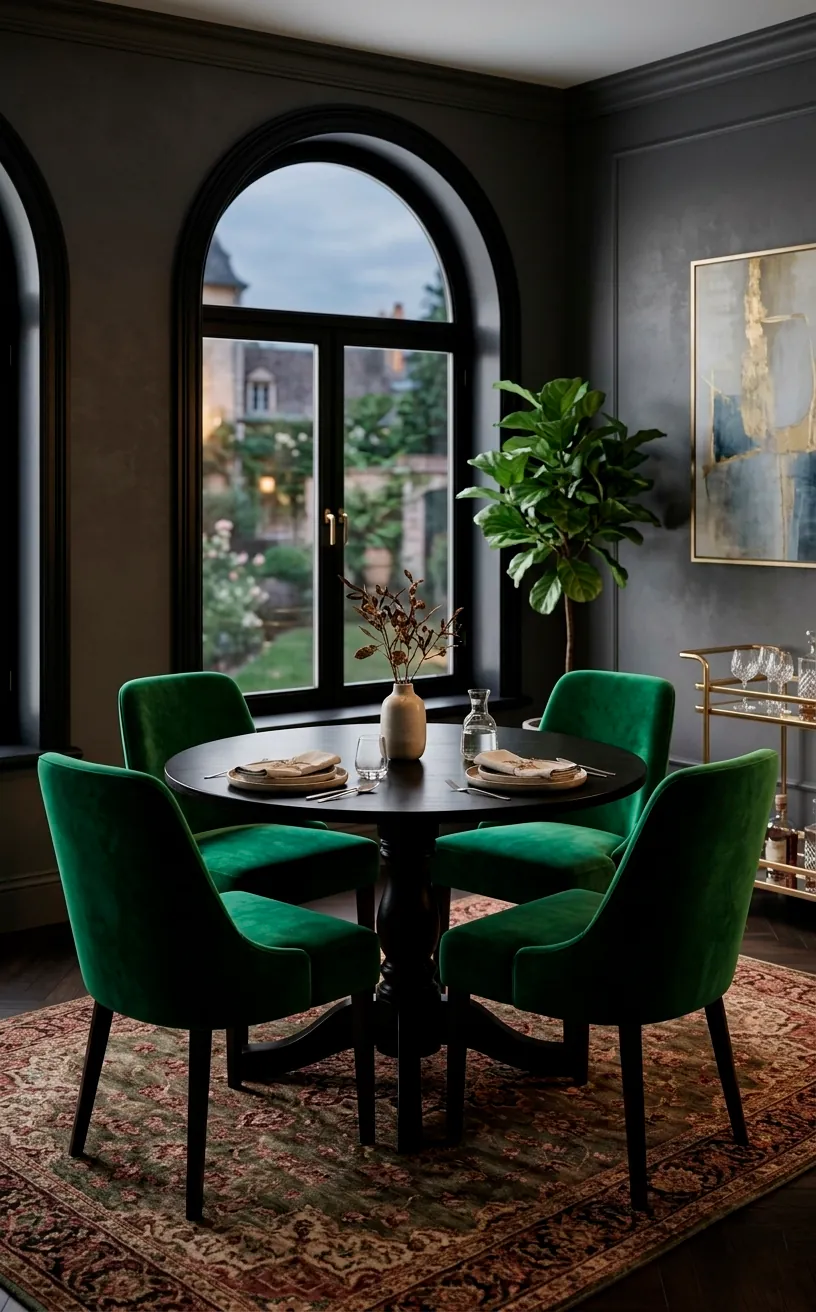 Hard wooden chairs feel a bit too ‘country kitchen’ for a dramatic room. I swear by velvet dining chairs in deep jewel tones like emerald, sapphire, or even a rich burnt orange. Velvet catches the light in such a unique way, adding a shimmering texture that breaks up the matte walls.