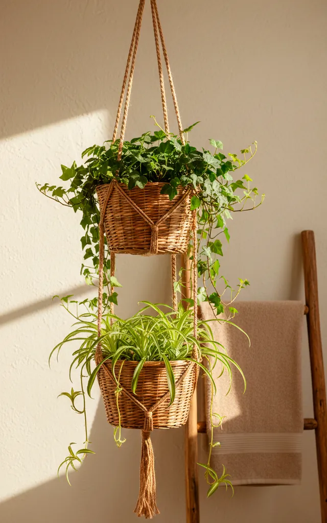 Plants and wicker are the ultimate power couple of the boho world. Ever noticed how a plain plastic pot makes a beautiful fern look a bit sad? I started tucking my moisture-loving plants into hanging wicker baskets to draw the eye upward. This trick saves precious counter space and adds vertical interest to cramped bathrooms. Just ensure you use a plastic liner inside the basket. You don’t want water dripping onto your floor every time you mist your pothos!