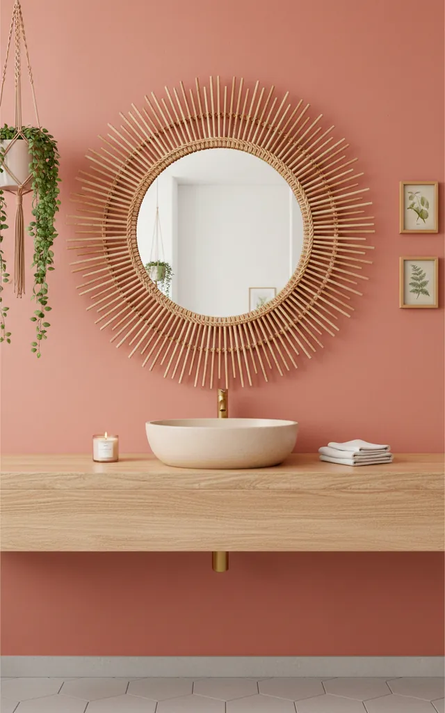 Standard frameless mirrors feel a bit ‘builder-grade,’ don’t you think? I replaced my basic medicine cabinet with a round wicker-framed mirror and the room instantly felt double the size. The circular shape breaks up all those harsh, rectangular lines from your shower and tiles. It’s like adding a piece of sun-shaped art to your wall. Does your bathroom feel a bit flat? A textured frame provides the depth you’ve been missing. Honestly, it makes checking for spinach in your teeth feel much more glamorous.