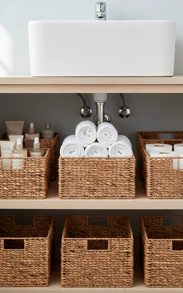 The dark abyss under the sink usually hides a chaotic mess of toilet paper and old sponges. I solved this by measuring my cabinet and filling it with matching wicker baskets. This system turns a disorganized pile into a clean, curated storage zone. It makes finding a spare roll of TP much easier for your guests, too. No one wants to go on a scavenger hunt in someone else’s cabinet! Use labels if you’re feeling extra fancy, but the baskets alone do most of the heavy lifting.