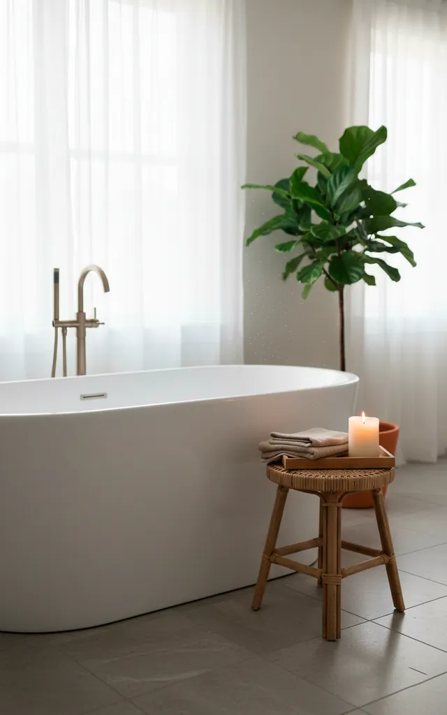 If you have the space, a tiny wicker stool is a total game-changer. I use mine as a perch for my book and a glass of wine during long soaks. FYI, it also doubles as a handy spot for your towel so you don’t have to shiver while reaching for the rack. These stools bring a sense of luxury and intentionality to the room. They say, ‘I actually take time to relax here.’ Even if you only have five minutes for a quick rinse, the stool makes the space feel like a dedicated sanctuary.