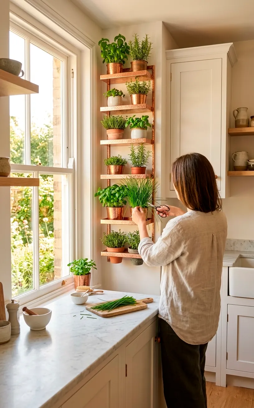 A luxurious kitchen herb wall with a tiered copper rack filled with fresh herbs under soft natural sunlight.