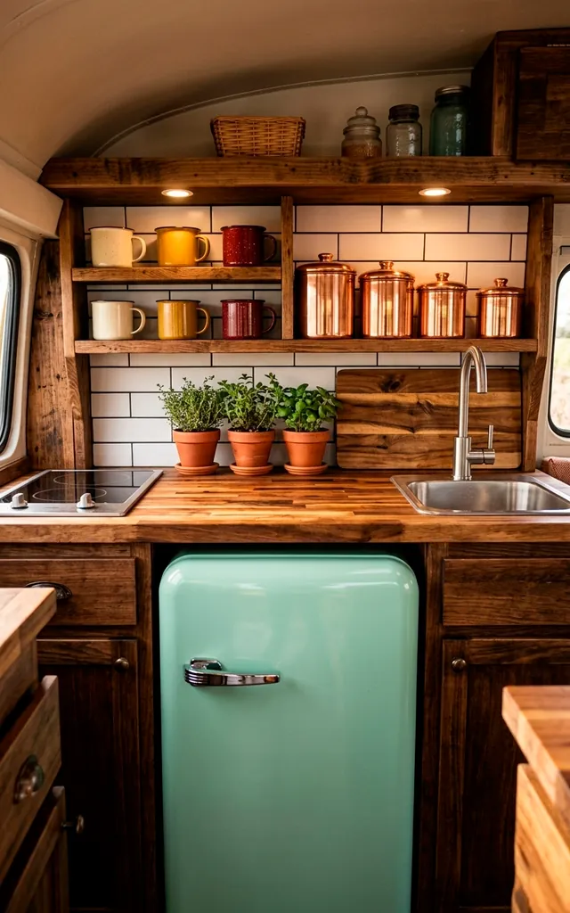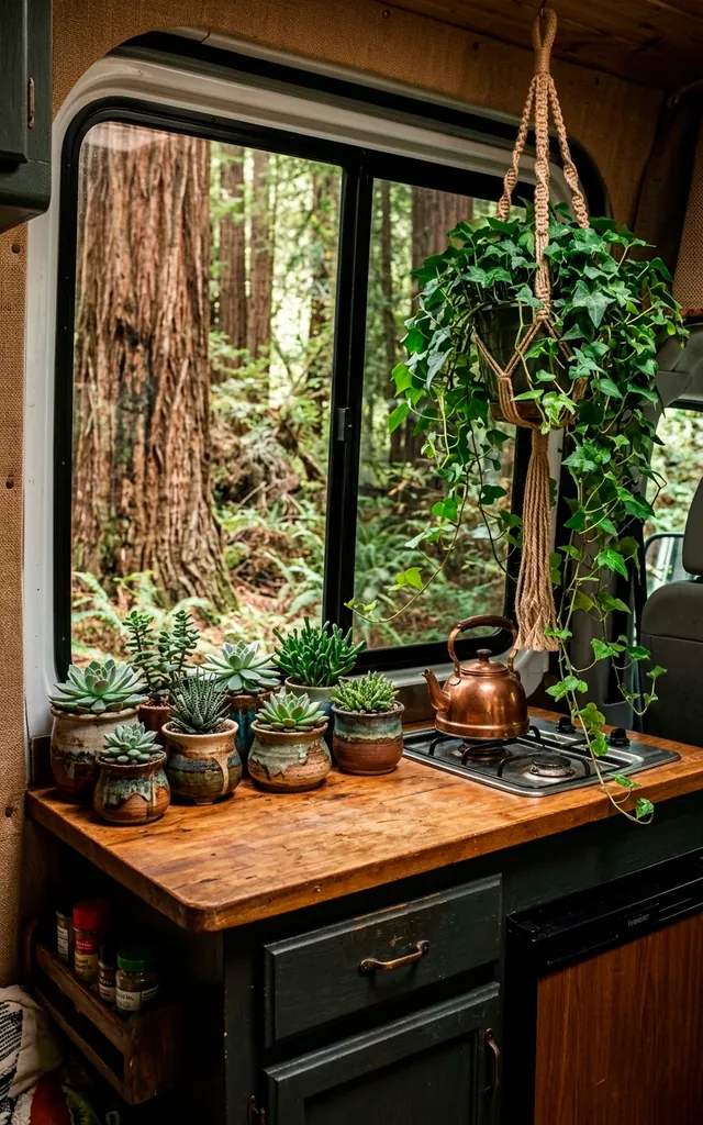 You live on the road, so bring the forest inside with you. Potted succulents and hanging ivy add life to the corners of your van. I use magnetic planters to keep my greenery from flying across the cabin during sharp turns. :/ Who doesn’t want to wake up next to a fresh fern? Wooden accents bridge the gap between your interior and the great outdoors. Use reclaimed wood for your tables to enhance that organic, grounded feeling.