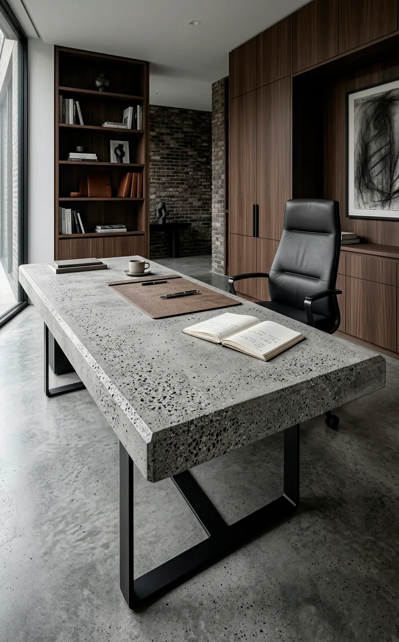 You deserve a desk that feels like a fortress. I love how a raw concrete slab anchors a room because it offers a heavy, permanent presence that flimsy wood just can’t match. You see those tiny air bubbles and swirl marks? Those imperfections prove the stone’s soul. It provides a cold, smooth surface that keeps your setup feeling grounded even when your workload gets chaotic.