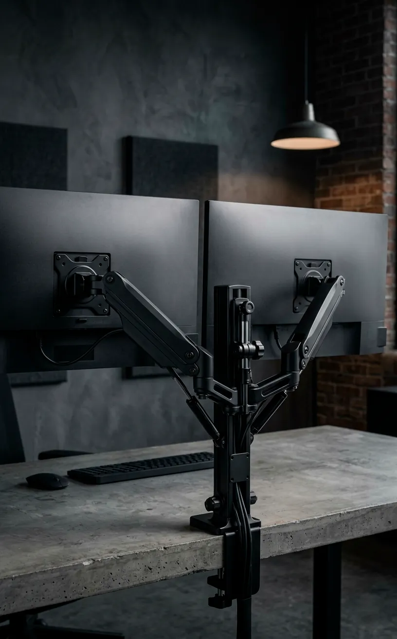 Nothing ruins a concrete aesthetic faster than a forest of silver and white plastic cables. I swapped my stock stand for a heavy-duty matte black monitor arm to reclaim my desk real estate. It makes your monitor look like it’s hovering in space. This single change cleans up your visual field and significantly boosts the ‘pro’ factor of your entire setup.