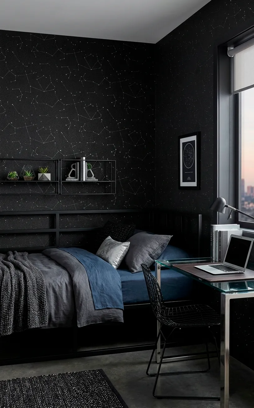 Sometimes less is more, right? These abstract midnight sky patterns ditch the literal stars for minimalist dots and thin, sharp lines. FYI, this looks incredibly sleek in a modern home where you want to avoid that “cluttered” look. Why overcomplicate a good thing?