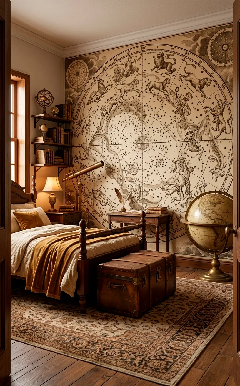 Go with a vintage celestial map for the little explorer who wants to know exactly where the Big Dipper hides. These murals cover the whole wall and turn the room into a giant, beautiful textbook—but, you know, a cool one. These designs usually feature aged parchment tones and intricate line work that looks incredibly high-end. It’s basically the “old money” version of space decor, and I am here for it.