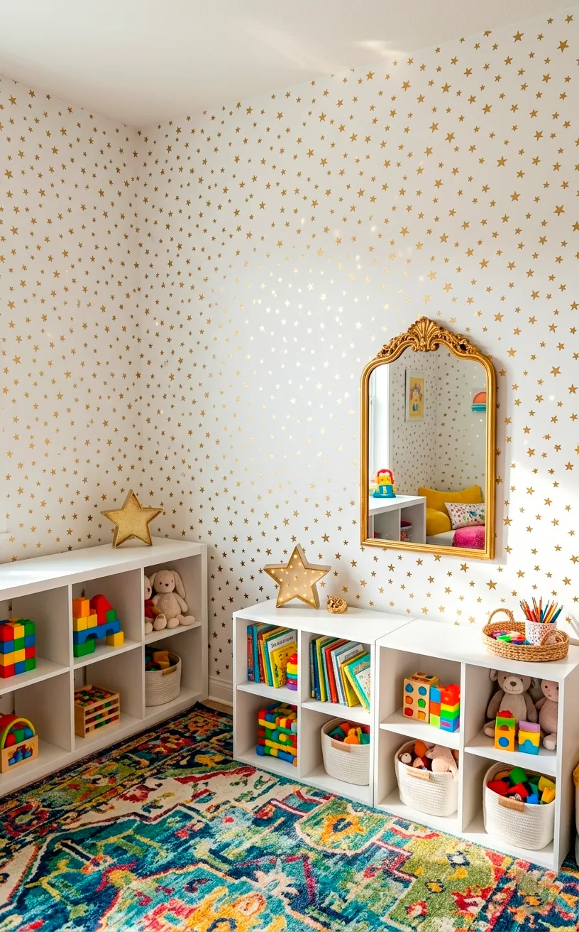 This style works beautifully in smaller rooms because the white base reflects light while the gold adds just enough sparkle. It’s basically the “clean girl aesthetic” but for kids. Pair it with some gold-toned hardware or a mirror to really make those stars pop. It’s sophisticated, simple, and honestly quite stunning.