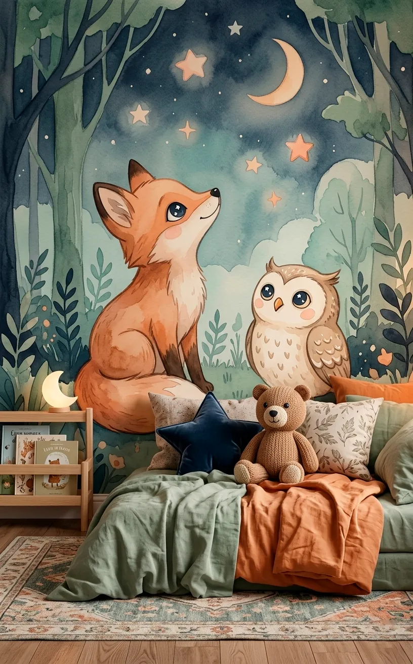 Plus, the muted earth tones keep the room feeling grounded and cozy rather than chaotic. Who wouldn’t want to sleep in a forest under the stars? 🦊