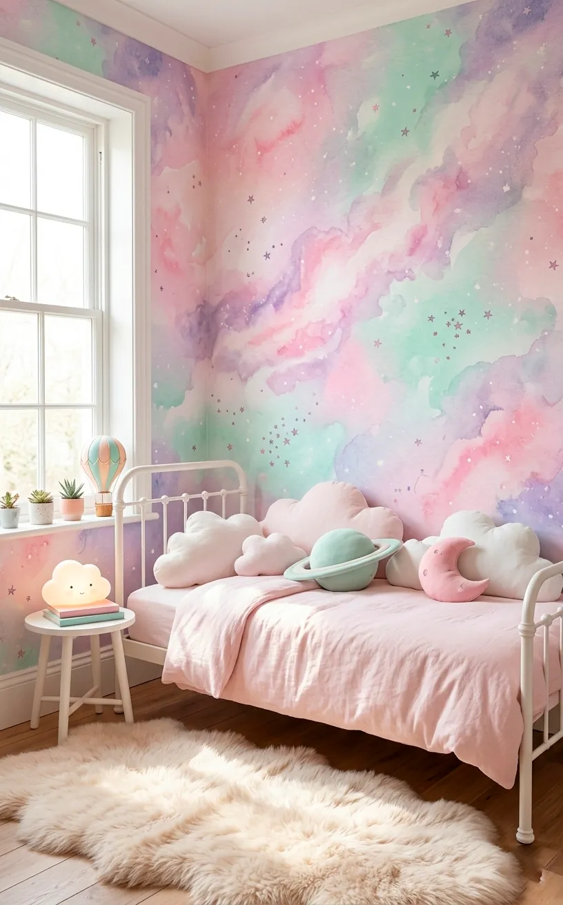 If dark blue feels too heavy for your space, these pastel watercolor galaxies are a total game changer for a softer look. We’re talking swirls of blush pink, lavender, and mint green that look like a peaceful nebula. I love how these patterns hide the inevitable “crayon masterpieces” better than flat paint ever could. It’s basically functional art! Plus, the ethereal vibe pairs perfectly with white bedding and light gray accents. Who says the night sky has to be dark anyway? 🌌