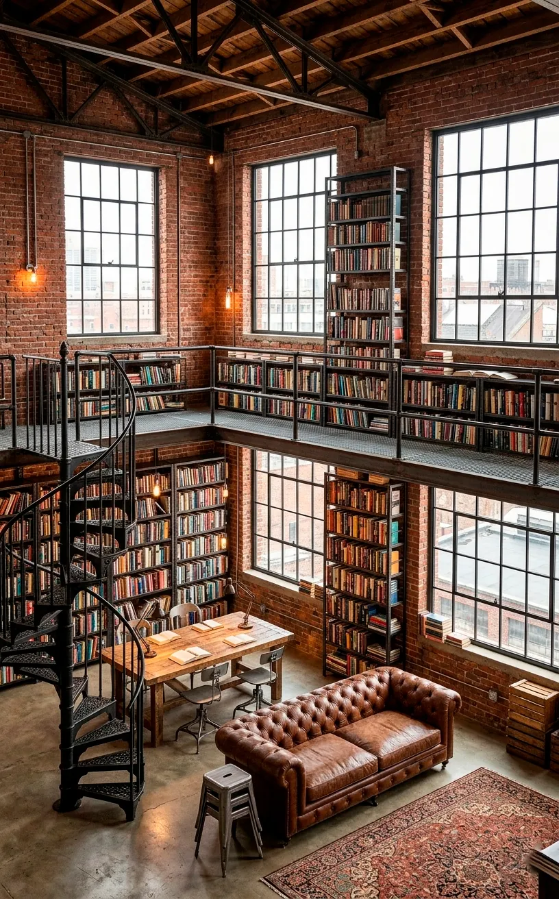 Exposed brick and black steel create a vibe that screams cool intellectual. I think this look works perfectly in converted spaces or modern builds. Do you appreciate a bit of grit in your decor? The open metal grating on the upper walkway adds a rugged texture that I adore. I personally prefer pairing this with oversized leather sofas to soften the industrial edge. It makes the whole room feel like a high-end bookstore in SoHo.
