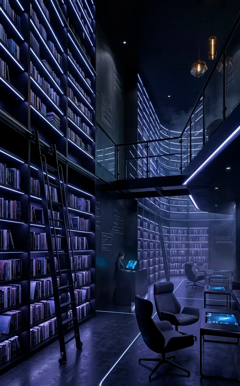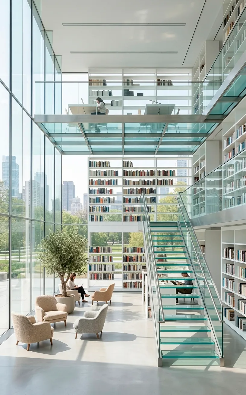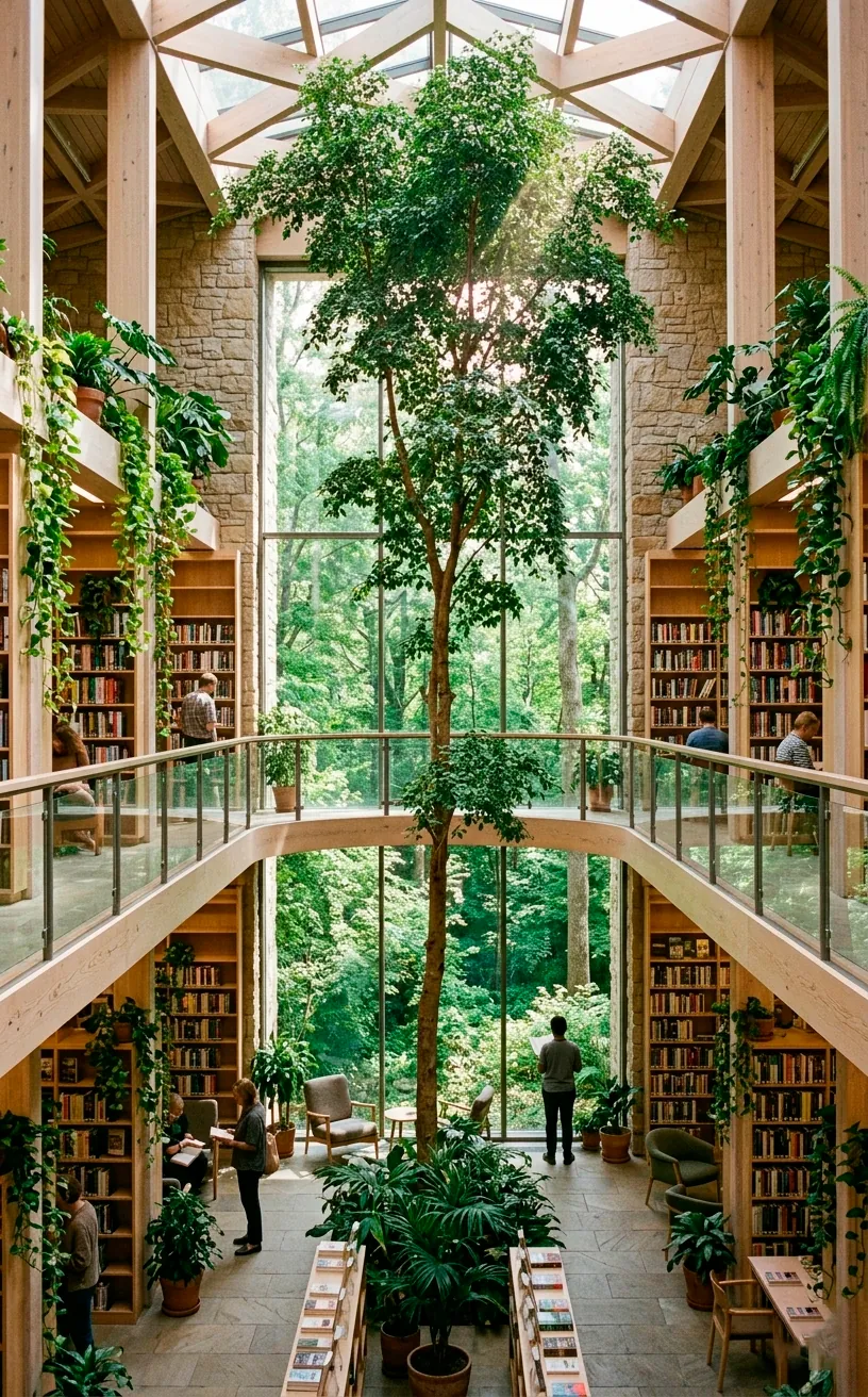 I believe every library needs a bit of greenery to breathe. This design incorporates large indoor trees and hanging vines among the two-story shelves. Doesn’t the smell of old paper and fresh leaves sound like heaven? Huge windows connect the interior to the garden outside, making the room feel twice as large. I find that natural light makes the colors of the book jackets pop beautifully. It feels like reading in a very sophisticated treehouse.