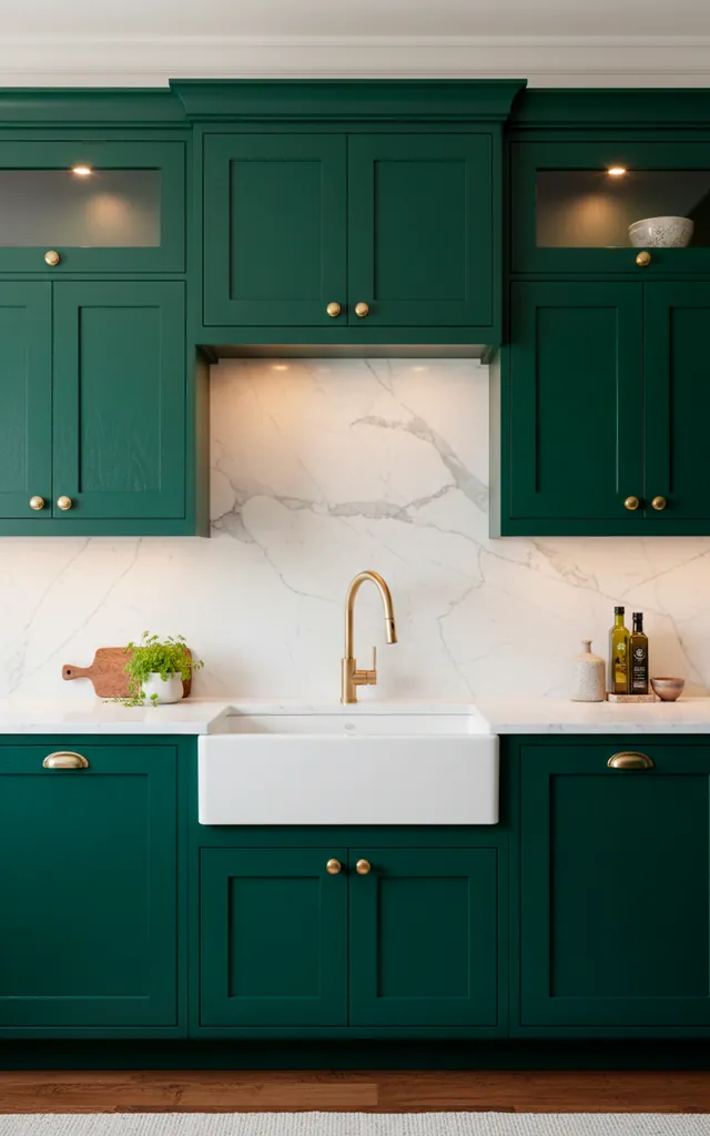 If you want luxury, emerald green is your best friend. Pair it with brass handles, and you’ve got a kitchen that looks like a high-end cocktail bar. I find that deep greens hide those annoying fingerprints way better than white does. Plus, brass adds that warm glow everyone craves. Does it get any classier than this?
