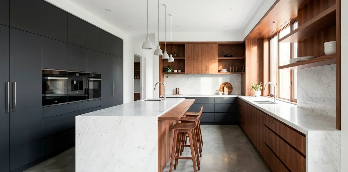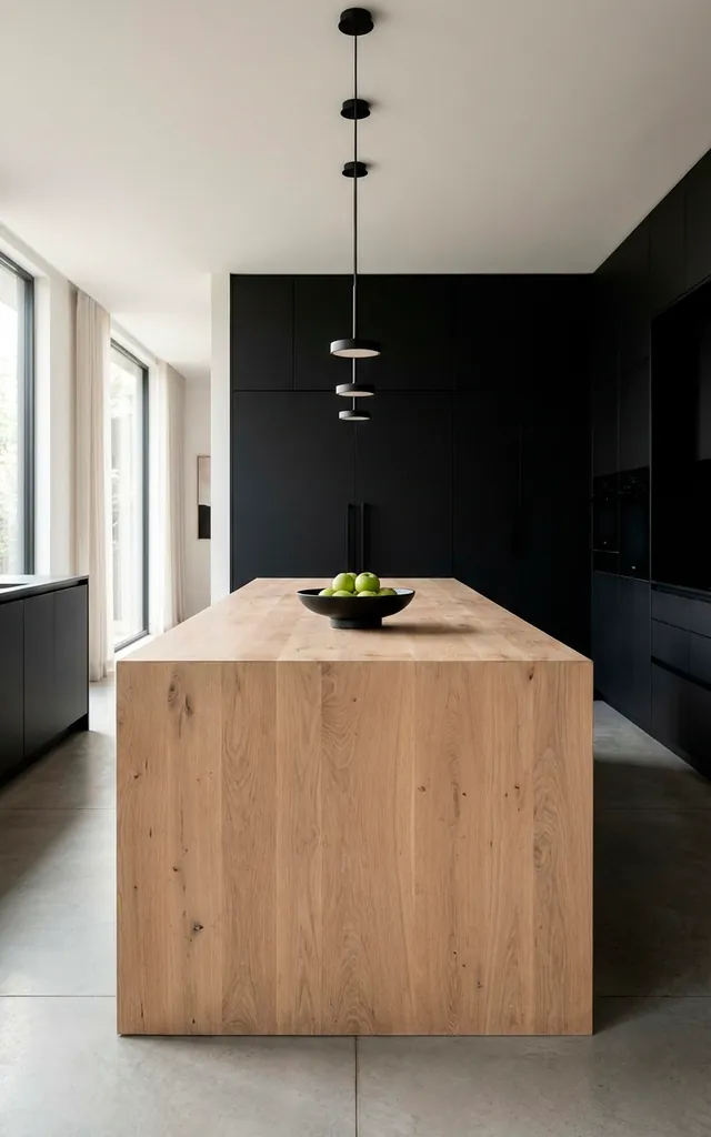 Matte black cabinets scream sophistication, while natural oak keeps the room from feeling like a sterile lab. I love how the raw wood grain softens the bold black surfaces. It creates a balance between ‘high-end gallery’ and ‘actual home where people eat.’ Ever noticed how a black island anchors a room? It’s a total power move for your decor.