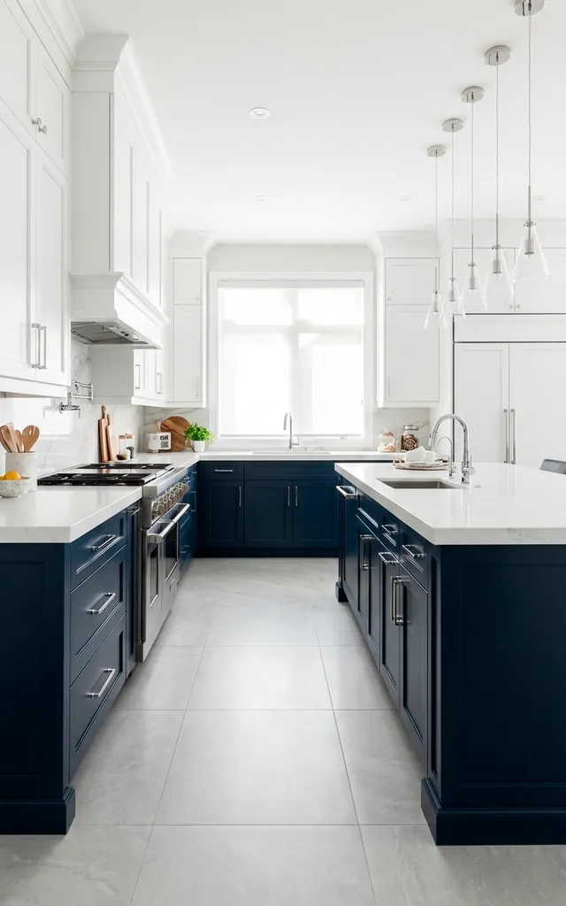 Navy and white is the tuxedo of kitchen design. It never goes out of style and looks incredibly expensive without trying too hard. I used this combo in a rental once, and it made the tiny space feel massive. Why settle for grey when you can have this much depth? Personally, I think navy is the new neutral.