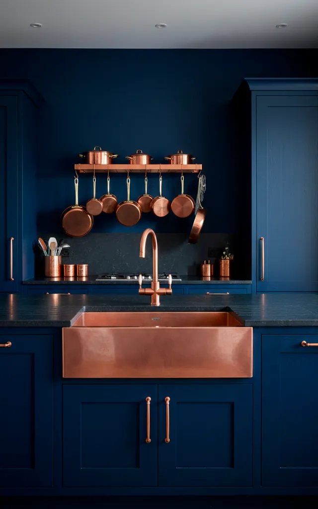 Midnight blue is nearly black but has that subtle ‘oomph’ when the light hits it. Copper accents provide a fiery contrast that makes the blue feel even deeper. FYI, copper sinks are a total game changer for this look. They age beautifully over time and add character.