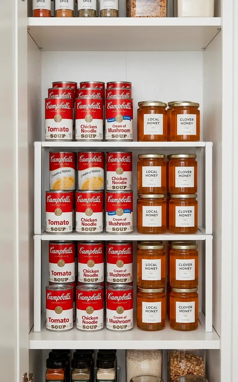 Instead of stacking cans into a precarious tower that will definitely fall over at 2 AM, use a riser to keep things visible and accessible. I love using these for tea boxes or mugs too.