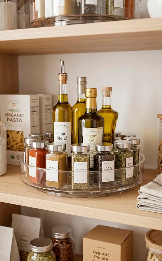 The back corners of a studio pantry are where spices go to be forgotten. A Lazy Susan (or turntable) solves this by bringing the back of the shelf to the front with one quick flick of the wrist.