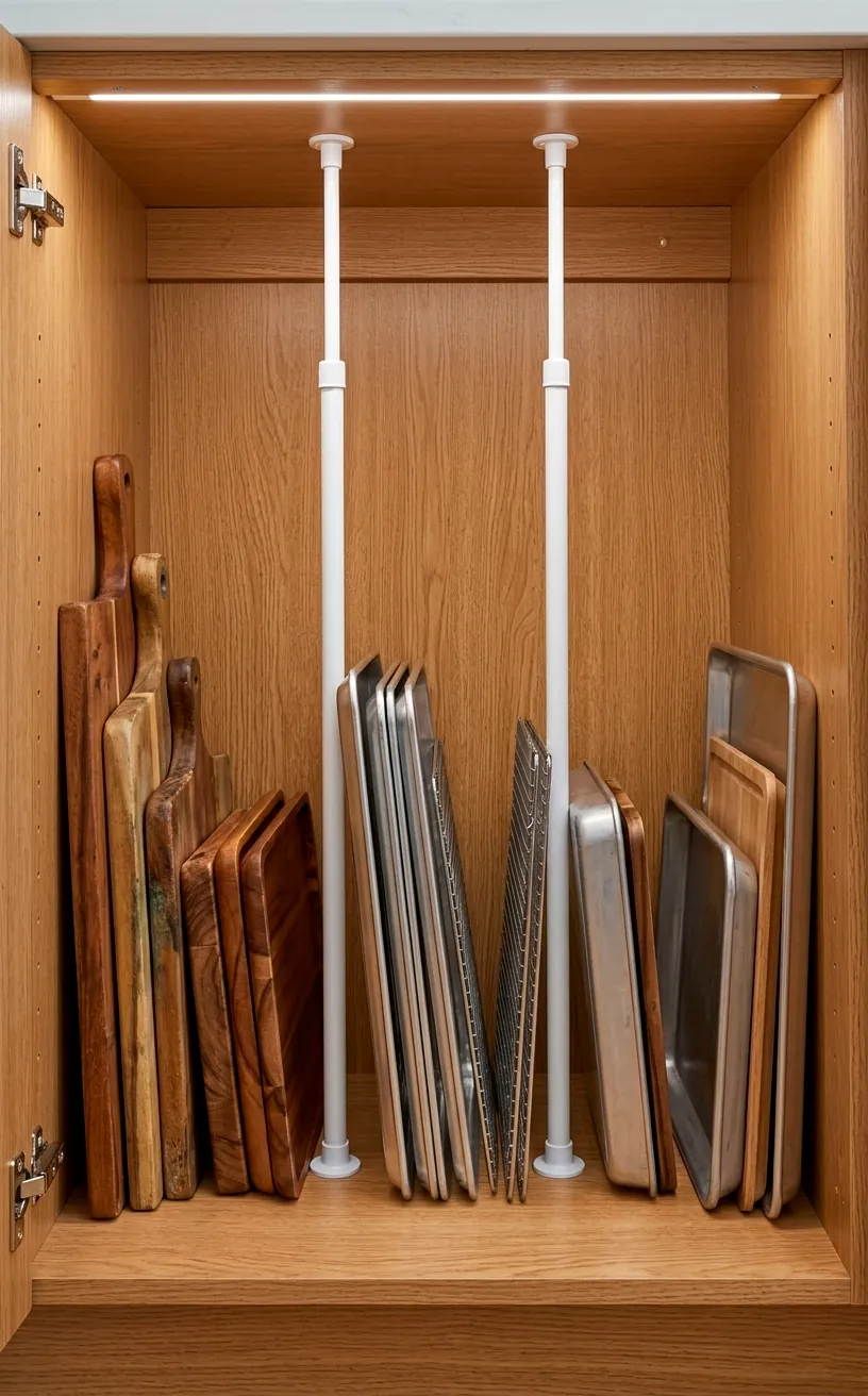 By placing small tension rods vertically between shelves, you create slots to stand these flat items upright.