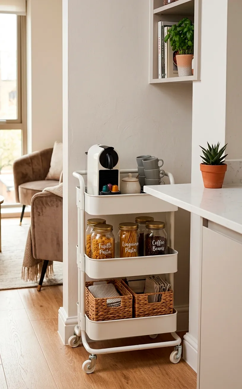 When you have absolutely zero cabinet space, bring in the reinforcements. A three-tier rolling utility cart is basically a portable pantry that can live in a corner and slide out when you’re prepping a meal.