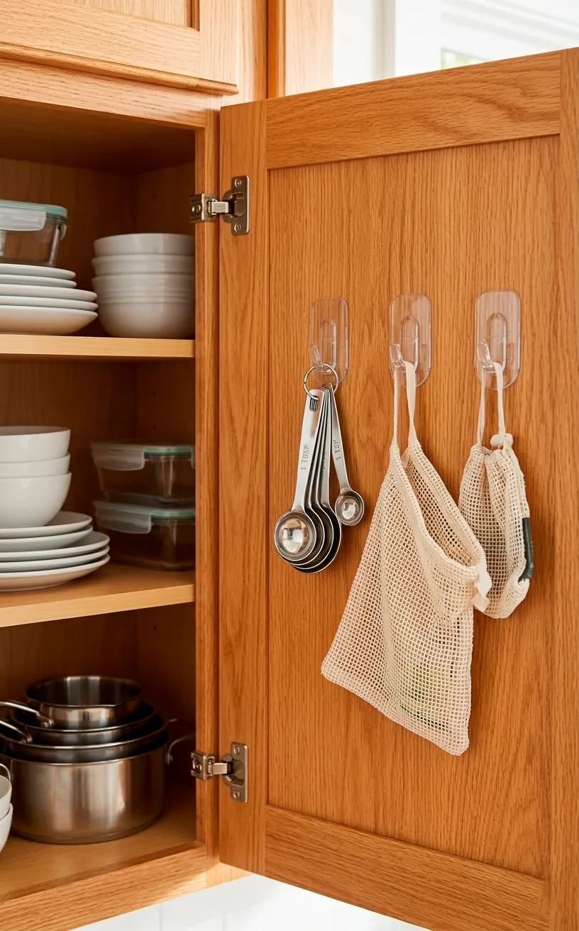 Never underestimate the power of a good adhesive hook. The inside of your cabinet doors can hold measuring cups, small colanders, or even mesh bags for produce. Hanging your tools keeps them from getting tangled in a junk drawer and makes you feel like a professional chef. It’s a low-cost, high-reward strategy that requires zero drilling—perfect for keeping your landlord happy. If you’re not using your cabinet doors for storage, are you even trying? Just kidding, but seriously, get some hooks. 🛠️