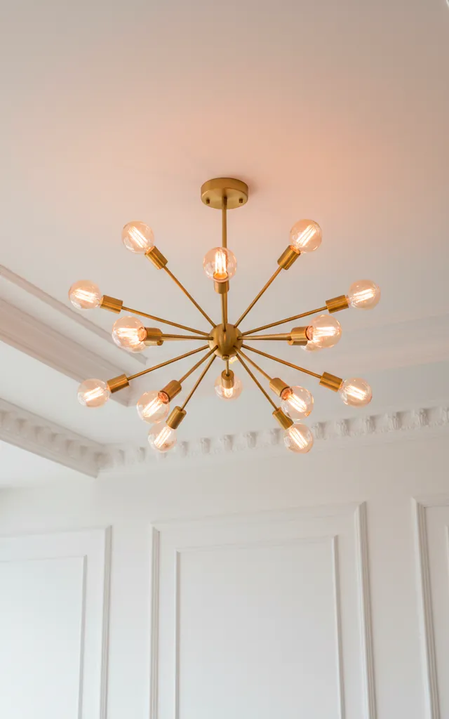 Lighting is the jewelry of the room, and a Sputnik chandelier makes a massive statement. It turns a ceiling from an afterthought into a design win. Does your kid love space? This design feels like a cool satellite without being a literal rocket ship 🙂 I recommend using warm LED bulbs to keep the room feeling cozy rather than like a sterile lab. It’s the perfect way to add some metallic flair—either brass or matte black—to the space.