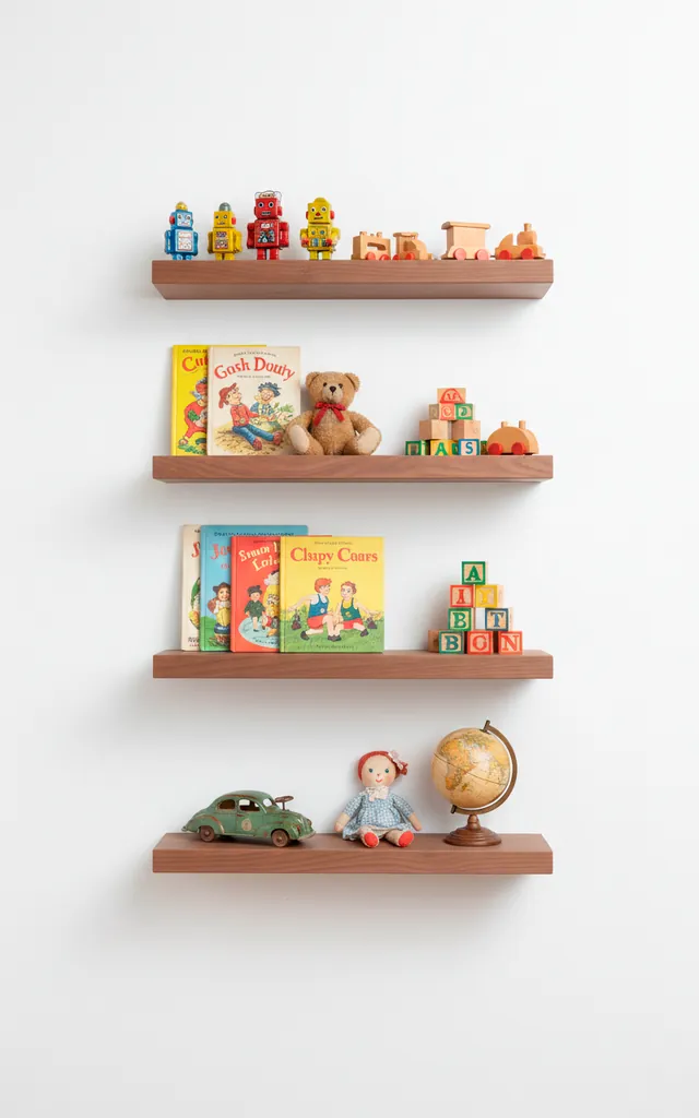 Wall space is prime real estate in a kids’ room. Floating shelves with metal brackets offer that modular look that I absolutely adore. You can display their favorite trophies or those tiny wooden animals that seem to multiply overnight. I find that keeping books at eye level actually encourages more reading. These shelves keep the floor clear, which is a gift to your toes when walking around in the dark. It’s a simple, sleek solution for the ‘too much stuff’ problem.