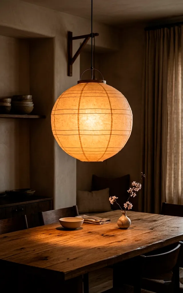 Hard overhead lights are the enemy of a good dinner party. FYI, shadows are just as important as light in Japandi design. I installed a large, textured paper pendant light that diffuses the glow and creates a warm, cozy ‘pool’ over the table. It completely changed the mood of my evening meals. Why eat under a spotlight when you can have a soft, golden atmosphere? Combine your main light with dimmable wall sconces or a floor lamp. This layers the light and lets you control the vibe based on the time of day.