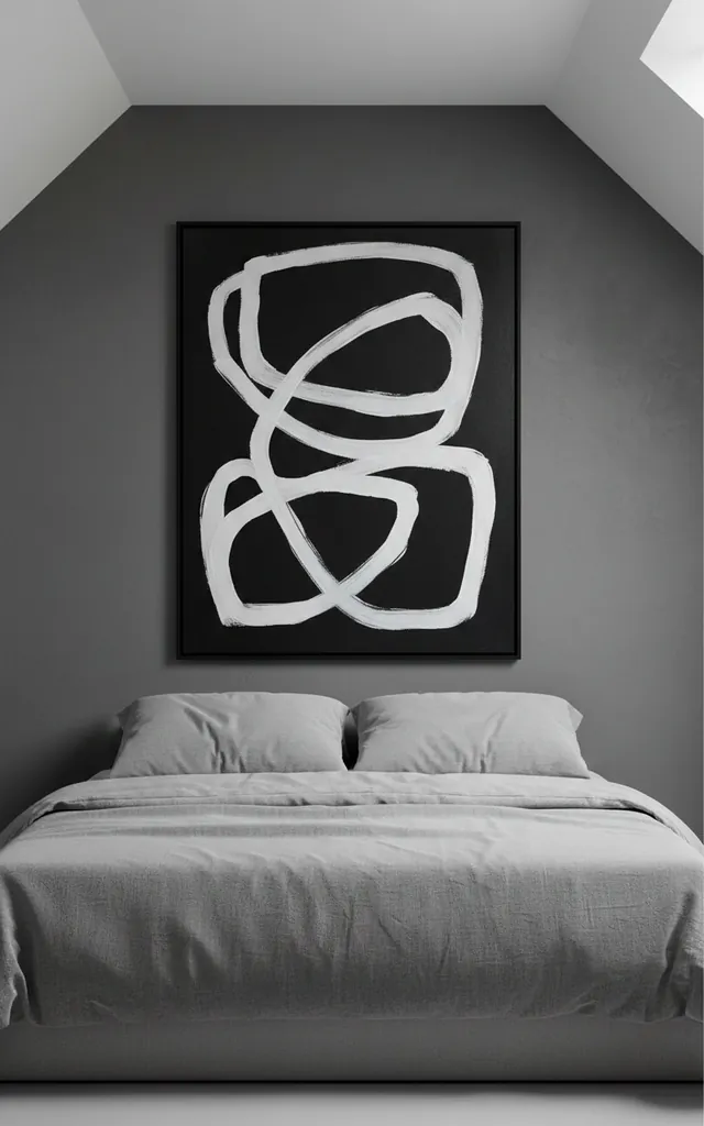 Huge, colorful paintings often clash with a sophisticated charcoal theme. I recommend sticking to monochrome photography or abstract line art with thin black frames. This keeps the focus on the room’s atmosphere rather than a single distracting piece. Is your wall looking a bit naked? A simple, oversized print ties the whole dark aesthetic together without overwhelming the senses. It maintains that quiet, moody confidence that defines a well-designed attic space.