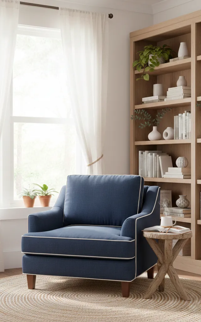 Who says navy only works in dark libraries? I love using navy to create a sophisticated coastal vibe that doesn’t involve plastic anchors. Pair a navy linen chair with light oak furniture to keep the space feeling airy. Do you want your home to feel like a high-end seaside resort? This look achieves exactly that without the annoying sand in your shoes.