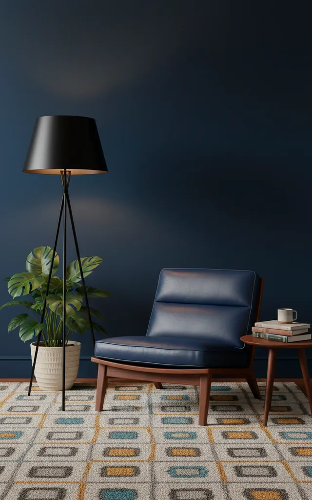 I adore how navy anchors the thin, tapered legs of mid-century furniture. It grounds the space while maintaining that retro-cool aesthetic. I suggest mixing navy walls with warm walnut wood for a timeless look. Why stick to boring brown when you can have a moody masterpiece?