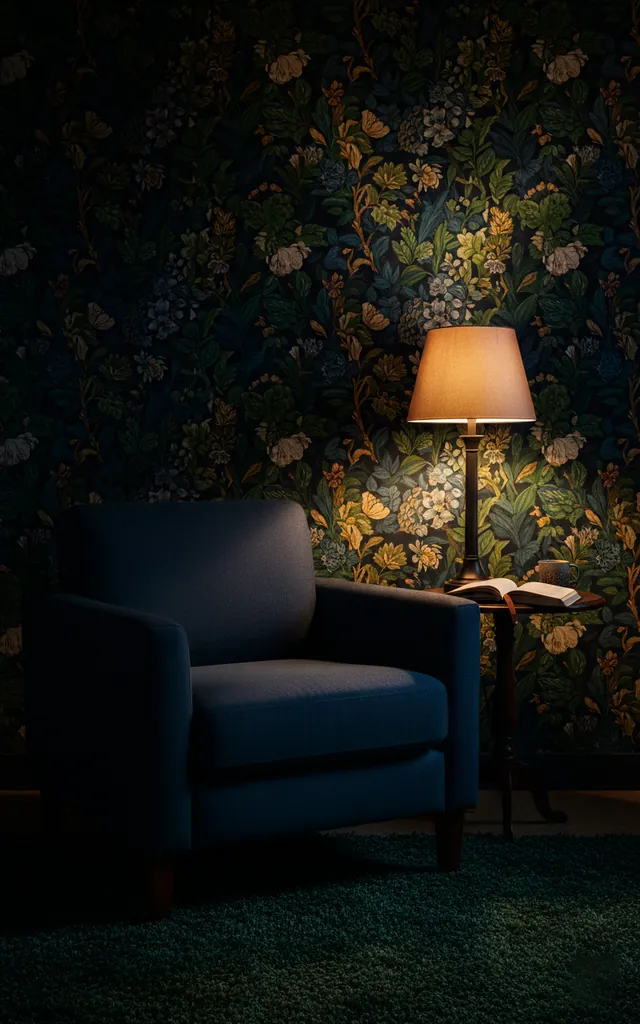 Sometimes a solid navy wall feels too safe for my taste. I recommend using a dark botanical wallpaper with navy undertones to add some serious drama. It makes the nook feel like a secret garden hidden inside your home. Does it feel bold? Yes, and that is exactly the point.