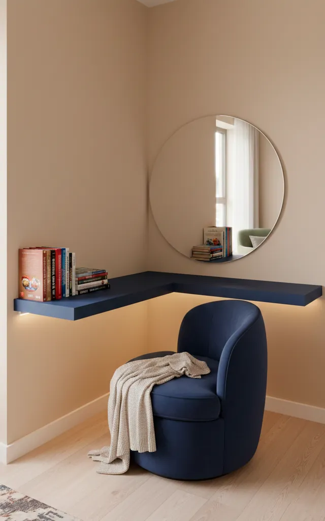 You don’t need a whole library to rock the navy look. I often transform tiny corners into ‘mini-nooks’ using just a navy floating shelf and a comfortable chair. It defines the area without taking up much floor space. It is a total game-changer for apartment living, IMO.