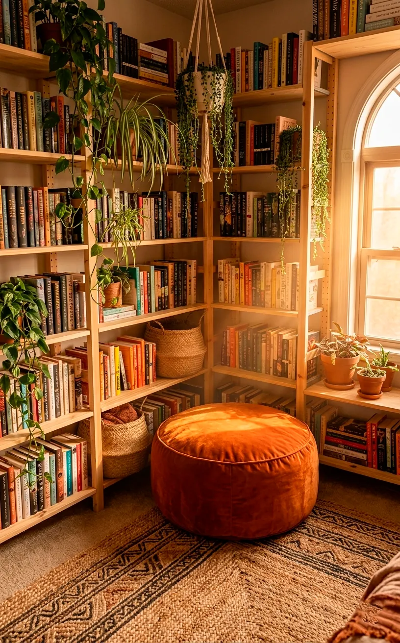 Bring some 70s soul into your library with a burnt orange velvet pouf. This color is pure magic during the autumn months, but honestly, it looks great year-round. It adds an earthy, grounded feel to the room that encourages a relaxed reading pace. I think the warmth of the terracotta tones pairs perfectly with indoor plants and macramé accents. It is the kind of piece that makes a library feel lived-in and loved rather than just a storage room for paper. FYI, this shade makes your library photos look incredible for the ‘gram. 😉