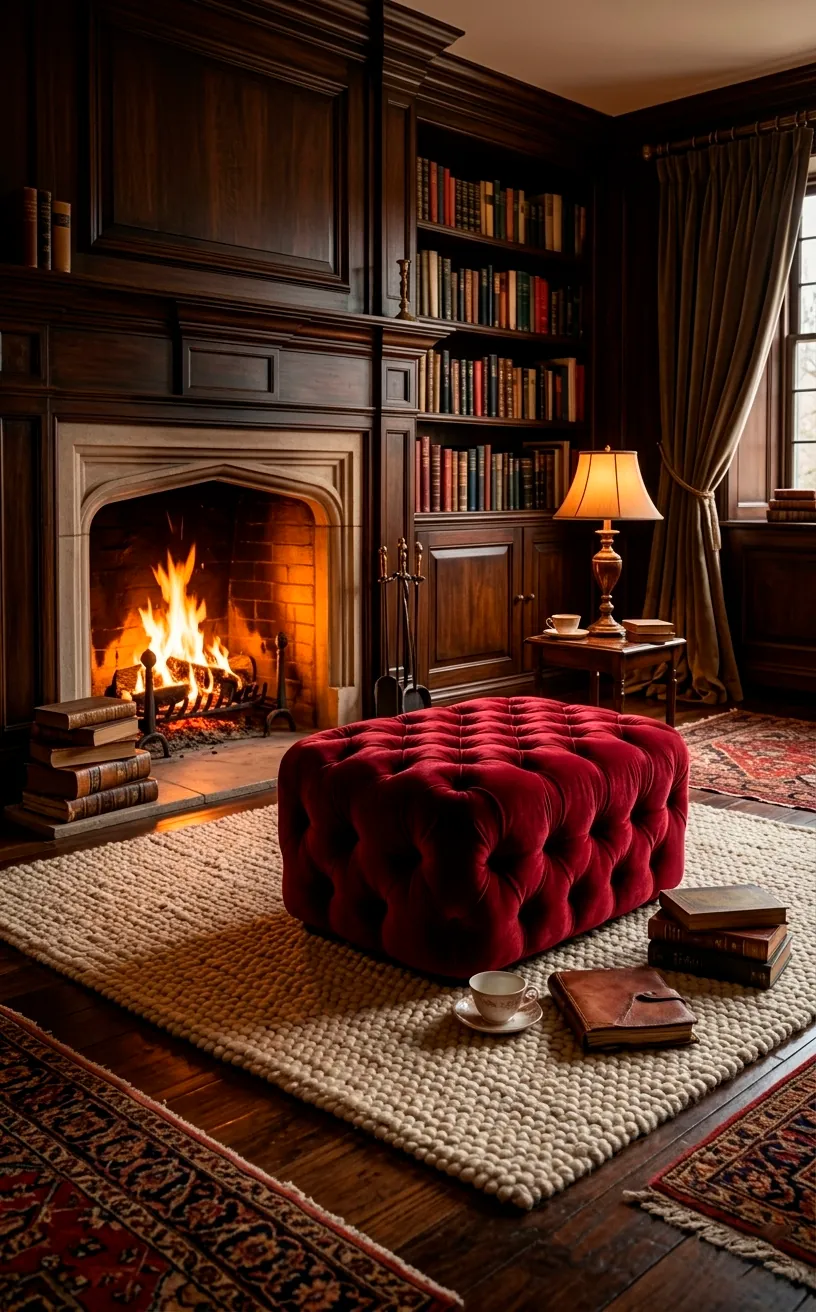 I love how the red velvet looks under a soft lamp; it develops a depth that other colors just can’t match. It’s bold, it’s brave, and it’s surprisingly versatile. Ever wondered why red is so common in old libraries? It’s because it commands attention without being obnoxious. This pouf is the final piece of the puzzle for a truly cozy, high-end library. ❤️