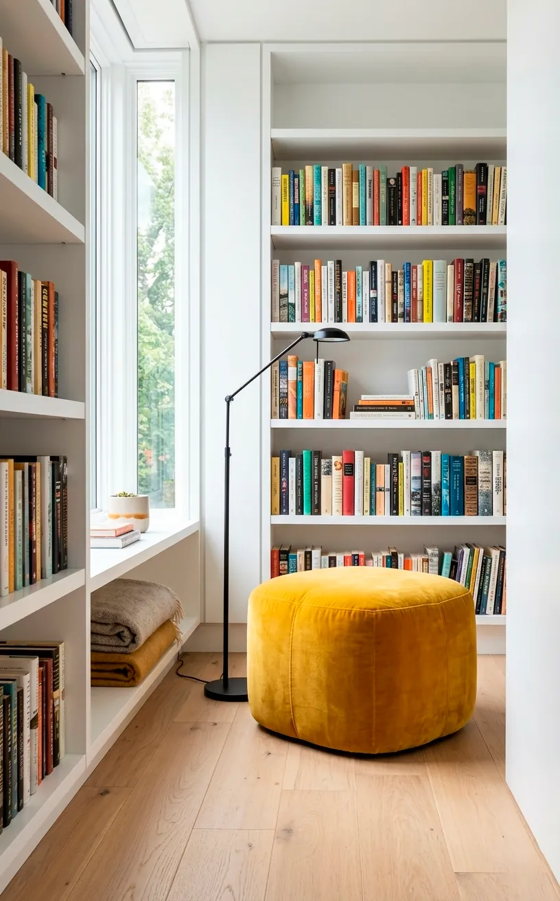 If your library feels a bit too serious, a mustard yellow pouf acts like a shot of espresso for your decor. It breaks up the monotony of brown wood and white pages with a cheerful, mid-century modern flair. I love how the golden hue catches the afternoon sun, making the whole corner feel warm even in the dead of winter. It is the perfect height for low-profile lounge chairs, and IMO, it’s the best way to add personality without overcomplicating things. Why settle for boring beige when you can have a sunbeam you can sit on?