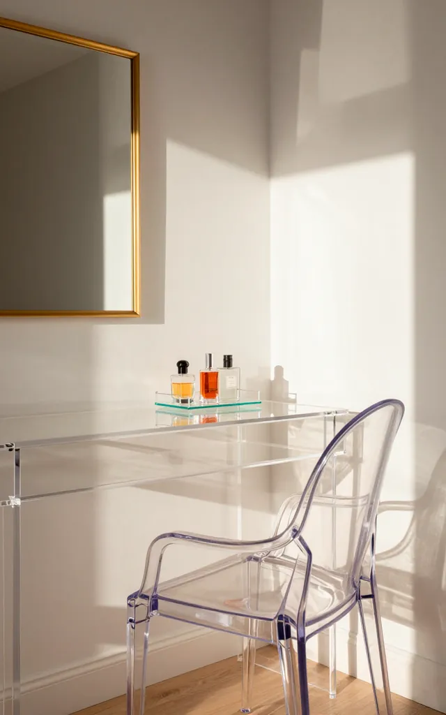I swear by acrylic furniture when space feels tight. Because these pieces are clear, they literally vanish into the room. I use a transparent ghost chair and clear shelving to keep my dressing area from looking like a cluttered warehouse. Why block your visual field with bulky wood? These pieces provide all the function without any of the visual weight. IMO, it’s the ultimate hack for anyone living in a glorified walk-in closet.
