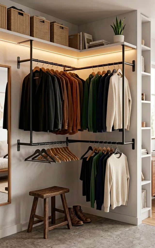 Most people ignore corners, leaving them for dust bunnies and regret. I suggest you install L-shaped hanging rods instead. This setup doubles your hanging space without eating into the center of the room. Does your current closet feel like a black hole? I find that corner racks bring everything into the light. Pair these with slim velvet hangers to save even more precious inches. I never look back once I claim that dead space!