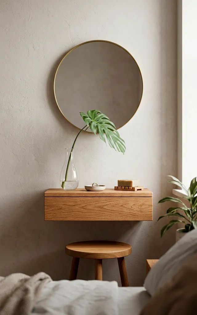 Bulky desks kill small rooms faster than bad lighting. I replaced my old vanity with a wall-mounted floating shelf. This trick keeps the floor visible, which tricks your brain into thinking the room is bigger. I add a large circular mirror above it to bounce light around the space. It’s functional, chic, and honestly, it makes me feel like I live in a boutique hotel. Why settle for a cramped corner when you can have a floating masterpiece?
