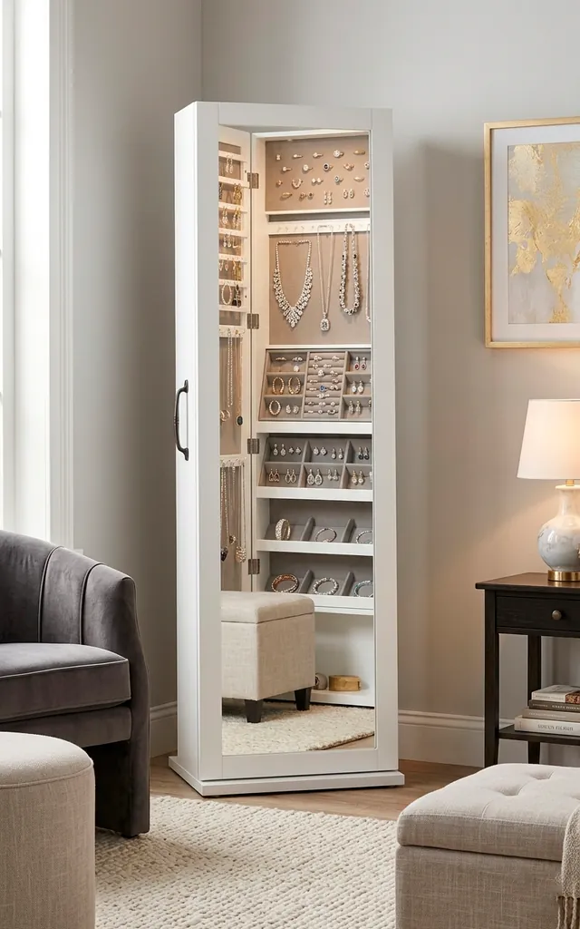 Every small dressing room needs a mirror, so why not make it work for a living? I use a full-length mirror cabinet that opens up to reveal hidden jewelry hooks and shelving. It’s like a secret agent for your wardrobe. It hides the clutter while making the room feel twice as large. Unless you enjoy staring at a pile of tangled necklaces, this is a total game-changer for your morning routine.