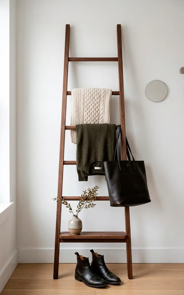 Ladders aren’t just for firemen and painters anymore. I use a leaning blanket ladder to organize my ‘next day’ outfits and scarves. It takes up zero floor space and adds a bit of architectural interest to a boring wall. It’s perfect for those pieces that aren’t quite dirty but aren’t quite clean either. You know the ones! It’s a stylish solution for the ‘chair-drobe’ problem that plagues us all. :/