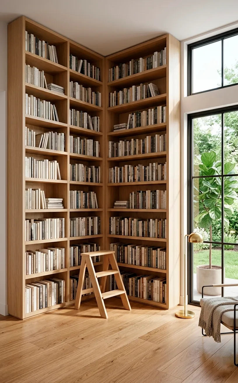 Why stop at one wall when you can have two? Wrapping your library around a corner creates a cocoon of literature that feels incredibly immersive. It’s a genius way to use that weird corner space that usually just collects dust or a lonely floor lamp. IMO, corner libraries make a room feel like a professional study instantly.