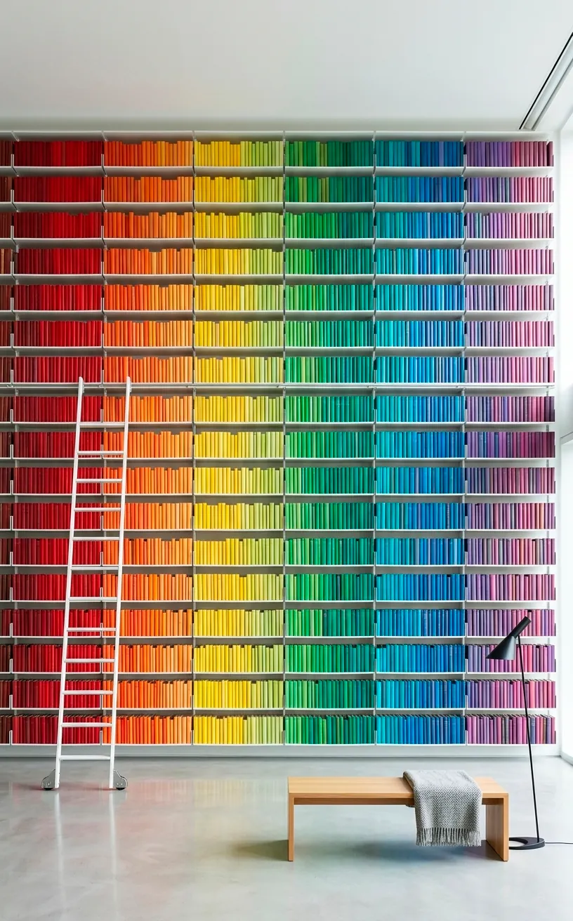Purists might hate it, but I think color-coding your books is a visual masterpiece. It turns your floor-to-ceiling library into a giant piece of art. When you have that much vertical real estate, the gradient effect looks absolutely stunning. Why have a boring wall when you can have a rainbow? It makes finding a specific book a bit of a game, but the aesthetic payoff is worth the extra thirty seconds of searching. It works best with white or light-colored shelves to let the colors pop. If you have a lot of brightly colored spines, this is your time to shine.